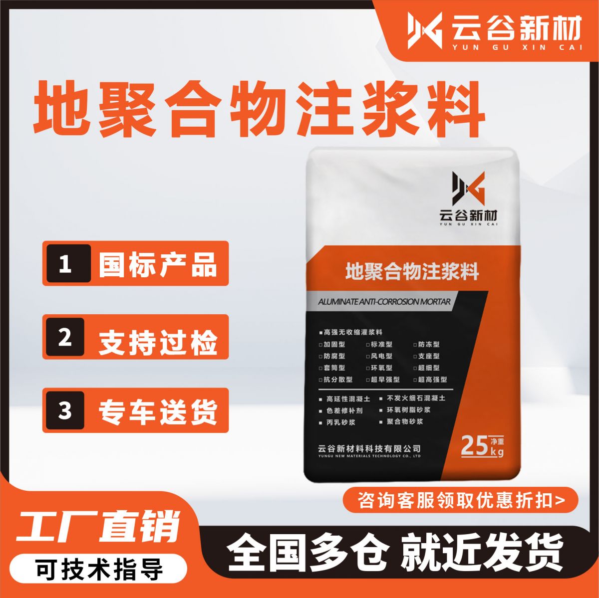 云谷新材料科技有限公司研发、生产和销售地聚合物水泥注浆料,有普通型和快凝型,产品价格:950-1350元/吨(量大面议),具有高强高韧、抗渗防漏、高流动性的特点,多用于隧道等地下岩体的注浆防水抢修加固;公路、桥梁、机场跑道等地基下陷的补强加固;各种地下建筑物开挖前的预处理中的护孔固壁,止涌堵漏等。