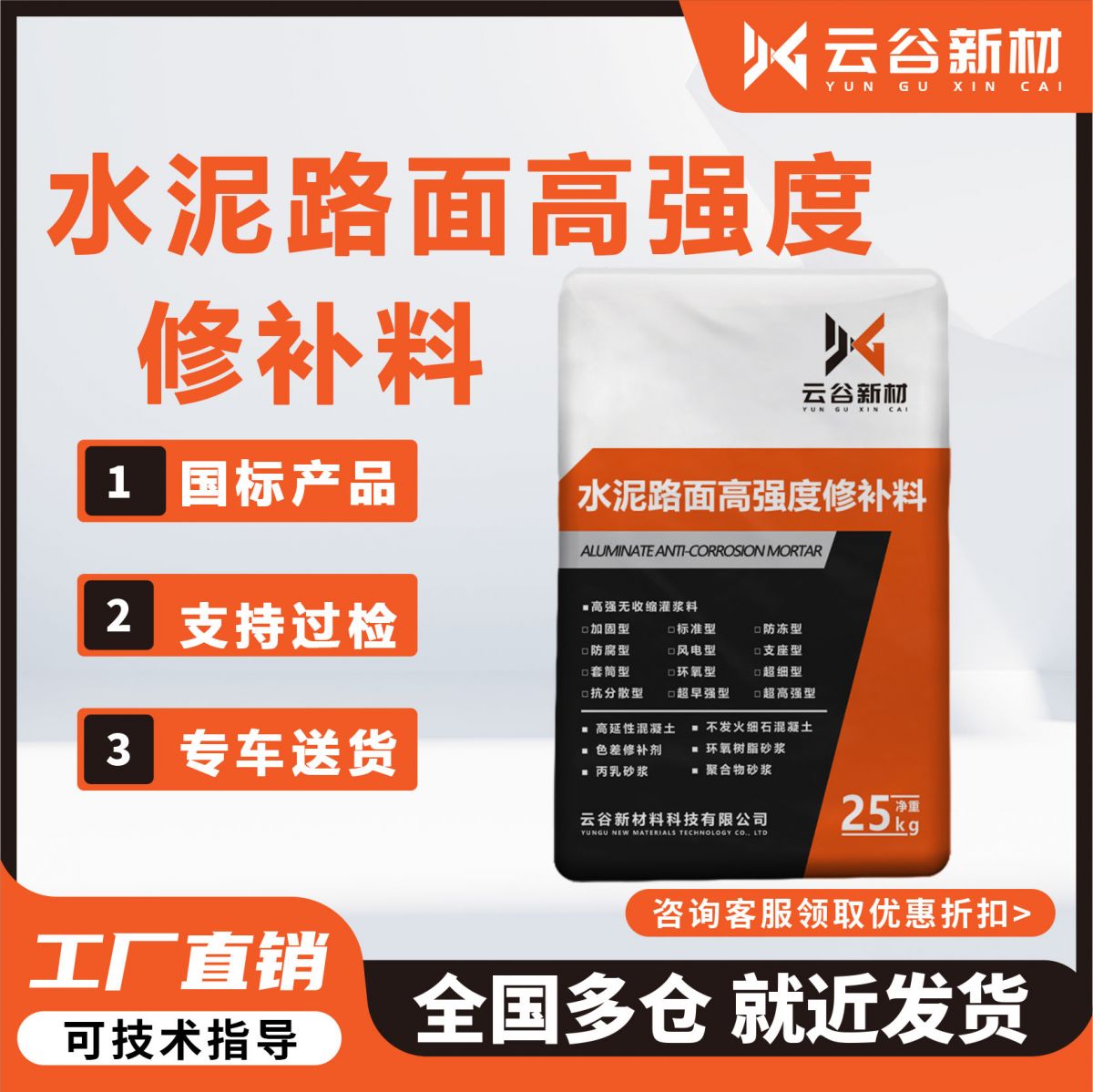 云谷新材料科技有限公司专业研发、生产和销售水泥路面修补料,产品价格:1600-3200元/吨(具体看型号,量大面议),产品具有高强快硬、高抗渗性、高抗裂性的特点,专治地面起皮、起砂 、露石子、蜂窝、麻面、坑槽、起灰等问题,适用于小区、广场、省道、国道、建筑楼顶等场所。该产品在混凝土涂装行业有较高的**度,始终立于行业之巅, 出色性能经过了无数项目的严苛检验,深受客户信赖与好评。