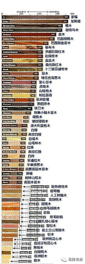 一张很形象的木材硬度表,各种美好温暖的木头色系、木纹、硬度、色彩一目了然。可以看到木材硬度排在前三位的紫檀、龙凤檀、和檀木。木材硬度**低的为非洲轻木和椴木。